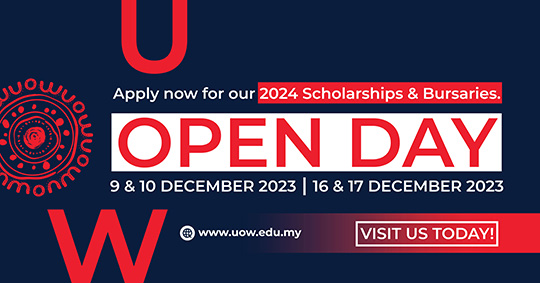 Start your journey Experience world-class facilities, superior tertiary and undergraduate programs with a global education approach to equip you for the dynamic real world. Search Quicklinks BROWSE COURSES INTERNATIONAL STUDENTS POSTGRADUATE STUDENTS HOW TO APPLY Browse programs by study area Business Built Environment Communication & Creative Arts Computing & Creative Media Engineering Hospitality, Tourism & Culinary Arts Health Science Law Pre-University Studies Professional Accountancy (ACCA & MICPA) Social Science Language Postgraduate Studies Marine BROWSE ALL PROGRAMS Welcome to UOW Malaysia INTAKE DATES & APPLICATION ❯ SCHOLARSHIPS & BURSARIES ❯ INTERNATIONAL STUDENTS ❯ STUDY ABROAD & EXCHANGE ❯ 360° VIRTUAL TOUR ❯ AWARDS & RANKINGS ❯ Upcoming events 13 December - 14 December, 2025 UOW Malaysia Open Day 10:00 am - 5:00 pm UOW Malaysia READ MORE 13 December, 2025 Education Fair (JM) 12:00 pm - 5:00 pm KSL Resort Johor Bahru City Centre READ MORE MORE EVENTS Latest News 05 December, 2025 Doctoral Student Wins Best Paper at International Finance Conference READ MORE 28 November, 2025 UOW Ranks 8th Nationally in Australian Financial Review Best Universities List READ MORE 26 November, 2025 UOW Malaysia Celebrates Class of 2025 at Dual Convocation Ceremonies READ MORE MORE NEWS