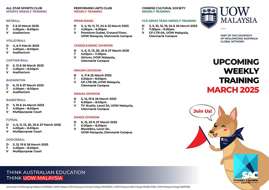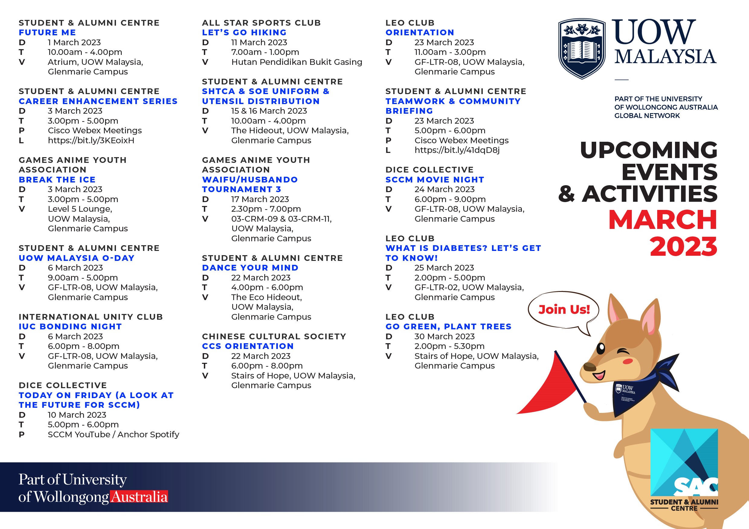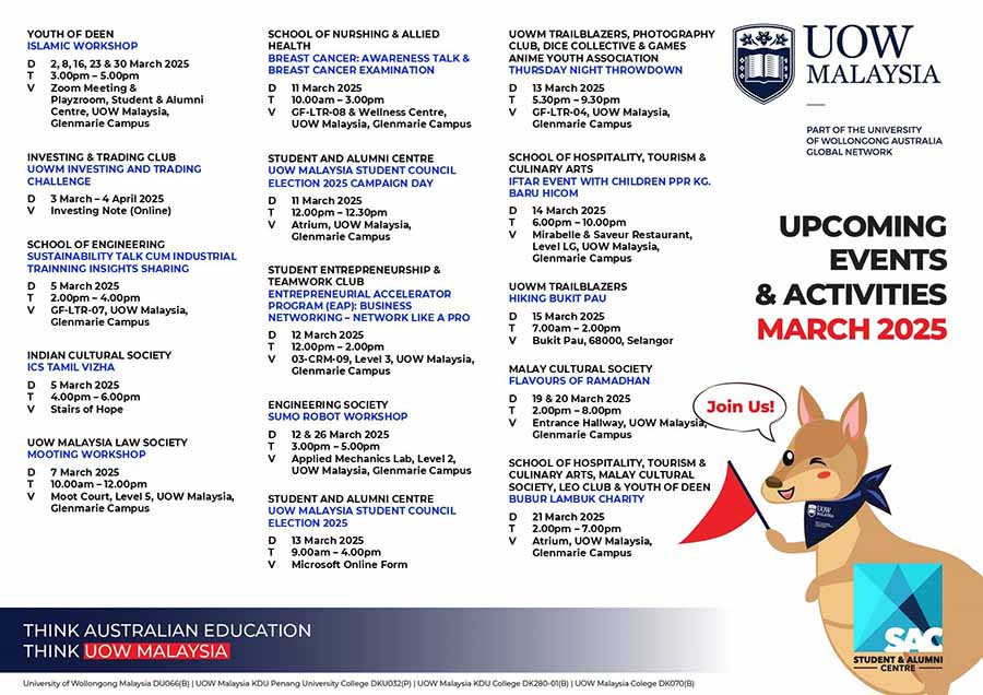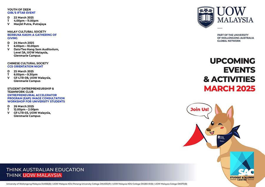 Selangor Penang NOVEMBER CHINESE CULTURAL SOCIETY HEY! LONG TIME NO SEE 1 Nov 2025 10.00am – 6.00pm Dato’ Teo Hang Sam Auditorium, Level 3A (Glenmarie Campus) STUDENT ENTREPRENEURSHIP & TEAMWORK CLUB ENTREPRENEURSHIP WEEK 2025: FINANCIAL INTELLIGENCE – EFFECTIVE STRATEGIES TOWARDS FINANCIAL FREEDOM 3 Nov 2025 12.00pm – 2.00pm GF-LTR-08 (Glenmarie Campus) INVESTING AND TRADING CLUB ENTREPRENEURSHIP WEEK 2025: BUDGET, SAVE, INVEST: A FINANCIAL SURVIVAL KIT 4 Nov 2025 12.00pm – 2.00pm GF-LTR-03 (Glenmarie Campus) INVESTING AND TRADING CLUB ENTREPRENEURSHIP WEEK 2025: BLOOD & ENTREPRENEURSHIP FOR CHANGE 5 Nov 2025 10.00am – 3.00pm Marketing Lobby (Glenmarie Campus) STUDENT ENTREPRENEURSHIP & TEAMWORK CLUB ENTREPRENEURSHIP WEEK 2025: BAZAAR DAY 5 & 6 Nov 2025 10.00am – 4.00pm Atrium (Glenmarie Campus) SHTCA SAN REMO PASTA COOKING DEMONSTRATION 7 Nov 2025 9.00am – 1.00pm Culinary Theatre 2, Level LG (Glenmarie Campus) UOWM TRAILBLAZERS JOURNEY UP SRI BINTANGZ 9 Nov 2025 8.00am – 2.00pm Sri Bintang Hill Trail, Taman Sri Bintang TLC SAY YES! PROGRAM: GRADUATE ATTRIBUTES (SESSION 1) *Compulsory for Oct 2025 Intake Student 10 Nov 2025 9.00am – 12.00pm GF-LTR-06 (Glenmarie Campus) GENERAL STUDIES DEPARTMENT MPU 2422N TEAMWORK AND COMMUNITY SUBJECT BRIEFING 12 Nov 2025 12.30pm – 1.00pm GF-LTR-02 (Glenmarie Campus) UOWM GAMES ANIME YOUTH ASSOCIATION & UOWM MOTORSPORTS & AUTOMOTIVE CLUB GRAN TURISMO SHOWDOWN 13 Nov 2025 12.00pm –5.00pm GF-LTR-04 (Glenmarie Campus) SCHOOL OF HOSPITALITY, TOURISM & CULINARY ARTS SAN REMO PASTA COMPETITION (SEASON 2) 14, 15 & 16 Nov 2025 8.00am – 5.00pm SHTCA, Level LG (Glenmarie Campus) SHTCA ROSEWOOD INTERNATIONAL COLLEGE X UOW MALAYSIA: GUEST CHEF SHOWCASE BY A MICHELIN-STARRED RESTAURANT 14 Nov 2025 12.00pm – 3.00pm Culinary Theatre 2, Level LG (Glenmarie Campus) TLC SAY YES! PROGRAM: GRADUATE ATTRIBUTES (SESSION 2) *Compulsory for Sept & Oct 2025 Intake Student 17 Nov 2025 9.00am – 1.00pm GF-LTR-06 (Glenmarie Campus) UOWM MOTORSPORTS & AUTOMOTIVE CLUB UP TO SPEED 17 Nov 2025 11.00am – 2.00pm GF-LTR-08 (Glenmarie Campus) SAC JOBSTREET BY SEEK: RESUME CLINIC & CAREER ADVICE SESSION 20 & 21 Nov 2025 10.00am – 5.00pm Atrium (Glenmarie Campus) SHTCA RPT SINGAPORE CAREER TALK 21 Nov 2025 2.30pm – 4.30pm Culinary Theatre 1, Level LG (Glenmarie Campus) UOW MALAYSIA CONVOCATION 2025 22 Nov 2025 8.00am – 1.00pm UOW Malaysia (Glenmarie Campus) SCCA CREATIVE INDUSTRIES EVENT DAY 25 Nov 2025 9.00am – 5.00pm Atrium (Glenmarie Campus) INVESTING AND TRADING CLUB INDUSTRIAL VISIT TO BURSA MALAYSIA 25 Nov 2025 1.30pm – 5.00pm Bursa Malaysia, Exchange Square, Bukit Kewangan, 50200 Kuala Lumpur SOE EuFiRECONFERENCE & COMPETITION 2025 26 & 27 Nov 2025 8.00am – 5.00pm Atrium & Dato’ Teo Hang Sam Auditorium, Level 3A (Glenmarie Campus) SCCM JINGLE MINGLE 28 Nov 2025 10.00am – 9.00pm Dato’ Teo Hang Sam Auditorium, Level 3A (Glenmarie Campus) SCCM COMIC FIESTA FELYNE TRAINING CAMP 29 & 30 Nov 2025 9.00am – 6.00pm Dato’ Teo Hang Sam Auditorium, Level 3A (Glenmarie Campus) ALL STAR SPORTS CLUB VOLLEYBALL 3, 4, 6, 10, 11, 13, 17, 18, 20, 24, 25 & 27 Nov 2025 4.00pm – 8.00pm Multipurpose Court 1 (New Court) FUTSAL 5, 7, 12, 14, 19, 21, 26 & 28 Nov 2025 4.00pm – 8.00pm Multipurpose Court 1 (New Court) BASKETBALL 3, 5, 7, 10, 12, 14, 17, 19, 21, 24, 26, & 28 Nov 2025 4.00pm – 8.00pm Multipurpose Court 2 (Old Court) FUTSAL 4, 6, 11, 13, 18, 20, 25 & 27 Nov 2025 4.00pm – 8.00pm Multipurpose Court 2 (Old Court) PERFORMING ARTS CLUB PARTS: PRISM BAND 3, 10, 17 & 24 Nov 2025 4.00pm – 6.00pm Premium Outlet, Ground Floor (Glenmarie Campus) PARTS: SINGING DIVISION 4, 11, 18 & 25 Nov 2025 5.00pm – 8.00pm GF-LTR-08 (Glenmarie Campus) PARTS VOCAL JAM (SINGING DIVISION) 6, 13, 20 & 27 Nov 2025 12.00pm – 1.00pm Busking Area, Ground Floor (Glenmarie Campus) PARTS: DANCE DIVISION 6, 13, 20 & 27 Nov 2025 6.00pm – 8.00pm Black Box, Level 3A (Glenmarie Campus) CHINESE CULTURAL SOCIETY CCS DRUM TEAM WEEKLY TRAINING 3, 5, 10, 12, 17, 19 & 24 Nov 2025 6.00pm – 9.00pm GF-LTR-04 (Glenmarie Campus) CHRISTIAN FELLOWSHIP BIBLE STUDY SESSION 7, 14, 21 & 28 Nov 2025 1.00pm – 2.30pm GF-LTR-04 (Glenmarie Campus) Follow us at Facebook Page and Instagram to stay in touch. JANUARY New Year 1 Jan 2025 Semester Break 2 Jan – 28 Jan 2025 USM Offshore Study Break Start 27 Jan 2025 Chinese New Year 29 Jan & 30 Jan 2025 FEBRUARY Orientation – Feb 2025 Intake 3 Feb 2025 SSD & SRC Feb 2025 Semester Day 1 3 Feb 2025 Be Resilience: Welcome To New Journey Talk 3 Feb 2025 SSD USM Offshore October Semester Exam 3 Feb – 17 Feb 2025 Thaipusam 11 Feb 2025 Say Yes! Program: Pre-Tertiary Workshop; Graduate Attribute (GA); Workshop 1 14 Feb 2025 TLC SRC 2025/26 Campaign Day 20 Feb 2025 SSD & SRC UOW 50th Anniversary Celebration ~ MOA with Industrial -Academic Partnership 20 Feb 2025 Business Department USM Offshore October Semester Break 24 Feb 2025 SRC 2025/26 Election 26 Feb 2025 SSD & SRC SRC 2025/26 Closed Election 28 Feb 2025 SSD & SRC Say Yes! Program: Graduate Attribute (GA) Workshop 2 28 Feb 2025 TLC MARCH Launching of Pop Up Market 5 March 2025 SSD Launching of English Day Program ~ One Day One Word 5 March 2025 Language Department 2025 UOW Malaysia KDU Penang Internship and Career Fair 5 March 2025 CPC 2025 UOW Malaysia KDU Penang Internship and Career Fair 6 March 2025 CPC Short Film Competition in conjunction with International Women’s Day 7 March 2025 Mass Comm Club Summer Camp 8 – 9 March 2025 BK SRC Majlis Sukan IPTS Malaysia 9 March 2025 KPM Pop Up Market 1 12 March 2025 SSD English Day Program 1 ~ Poem Competition in conjunction with English Language Day 12 March 2025 Language Department Nuzul Al-Quran 18 March 2025 Photo Competition in conjunction with International Day of Happiness 20 March 2025 SSD Hope for All ~ Baking with Penang Down Syndrome Association in conjunction with World Down Syndrome Day 21 March 2025 SSD & GT SRC USM Offshore March