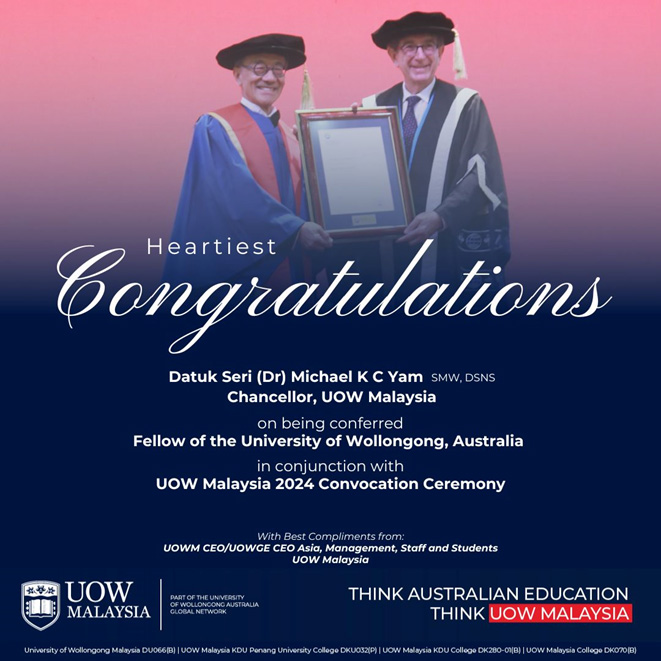 We are delighted to extend our congratulations to Datuk Seri (Dr) Michael Yam Kong Choy SMW, DSNS, Chancellor of UOW Malaysia on being conferred as Fellow of the University of Wollongong, Australia.