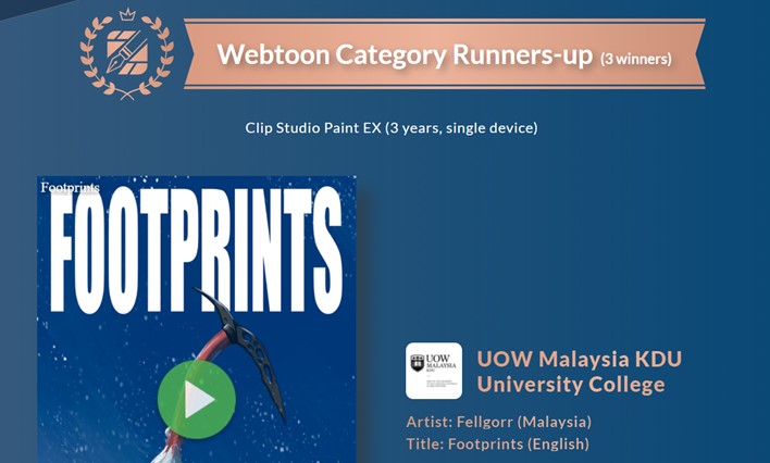 On the 15th of July 2021, UOW Malaysia KDU student, Danish Fitri Bin Jaslani from the Diploma in Sequential Art program, managed to be placed ‘runner-up’ in the webtoon category. Danish edged ahead of 73 submissions from 57 prestigious schools, such as Savannah College of Art & Design, to take home a 3-year license for Clipstudio Paint EX software. Webtoons are digital comic strips meant to be read vertically on the screen by making use of the infinite scrolling /canvas that was popularised by the Taiwanese.