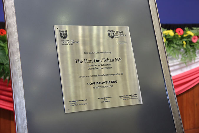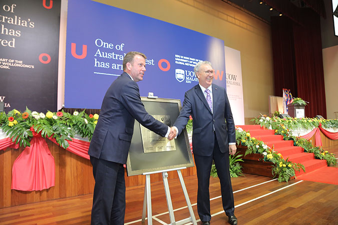 The Honourable Dan Tehan MP, Australia Minister for Education and Professor Paul Wellings CBE, Vice-Chancellor and Principal, University of Wollongong Australia during the official unveiling of the plaque to commemorate the official inauguration of UOW Malaysia KDU