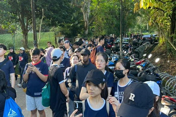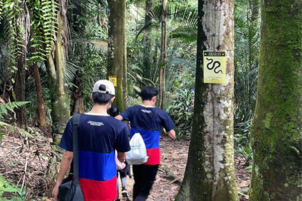 At 7:45 am, the participants exited the school bus and departed to the venue (Hutan Pendidikan Bukit Gasing) from UOW Malaysia, Glenmarie Campus. Before the departure, the BODs did a headcount to ensure all the participants were on the bus safely. At 8:30 am, the participants arrived at the destination and gathered in front of the entrance. The Vice President gave a short briefing to all the participants to ensure they were aware of the safety matters and the journey of the Hiking area.