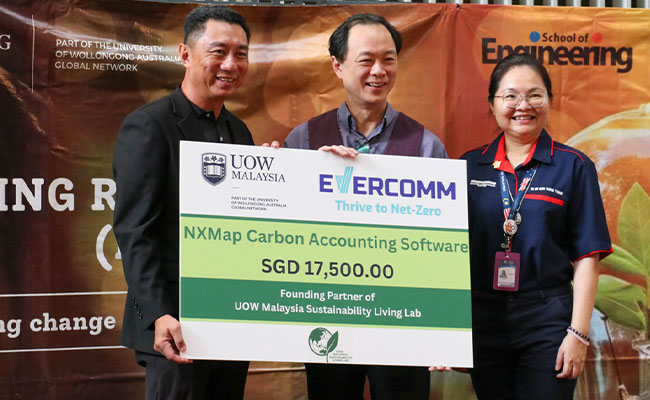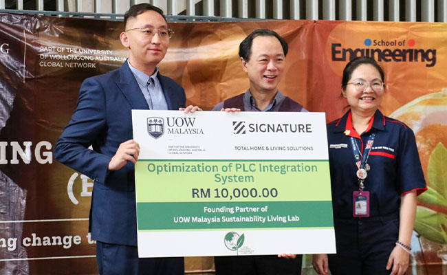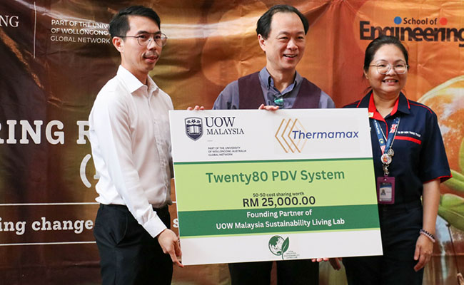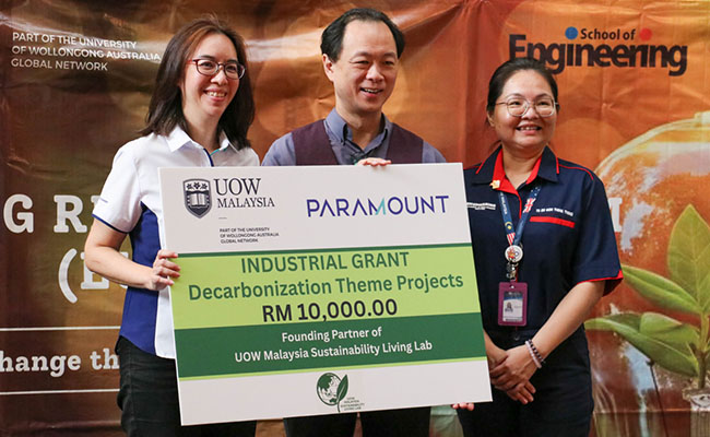 The SLL is designed as a quadruple helix platform, fostering collaboration across academia, industry, government, and community. A mock cheque presentation ceremony worth of RM100,000 celebrated the support of UOW Malaysia’s founding industry partners: Paramount Corporation Berhad, Evercomm, Thermamax Sdn Bhd, Signature Manufacturing Sdn Bhd and PMO Innovations where all instrumental in co-developing pilot projects and mentoring student innovators. Thermamax Sdn. Bhd. co-developing and co-funding the Passive Displacement Ventilation (PDV) Installation at UOW Malaysia’s Zing Hub. This initiative is being implemented on a 50-50 cost-sharing basis, with the goal of enhancing thermal comfort and reducing HVAC energy consumption. Evercomm providing the NXMap Carbon Accounting Software, to support Greenhouse Gas Inventory accounting and monitoring, data analytics, and sustainability reporting across campus operations and student research. Paramount Corporation Berhad supporting student-led Decarbonization Theme Projects while also offering Utropolis Marketplace as a real-world testing ground for sustainability solutions developed under the SLL framework. Signature Manufacturing Sdn Bhd creates pathways for students to gain industry exposure in automation technology and smart factory systems, fostering a sustainable Industry 4.0 ecosystem as well as talent development. PMO Innovations empowers SLL project team to turn visionary ideas into impactful, sustainability-driven innovations through its AI-enabled G.R.E.E.N. methodology to systematically reduce greenhouse gas emissions, enhance organisational resilience, and accelerate the journey toward net-zero.