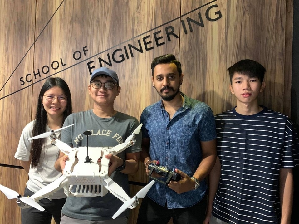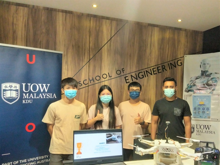 Lee Wei Hou, Pavithren Uthayasurian, Teoh Jiehan and Chan Lap Foong demonstrate their light-weight delivery drone called ‘Harpy’.