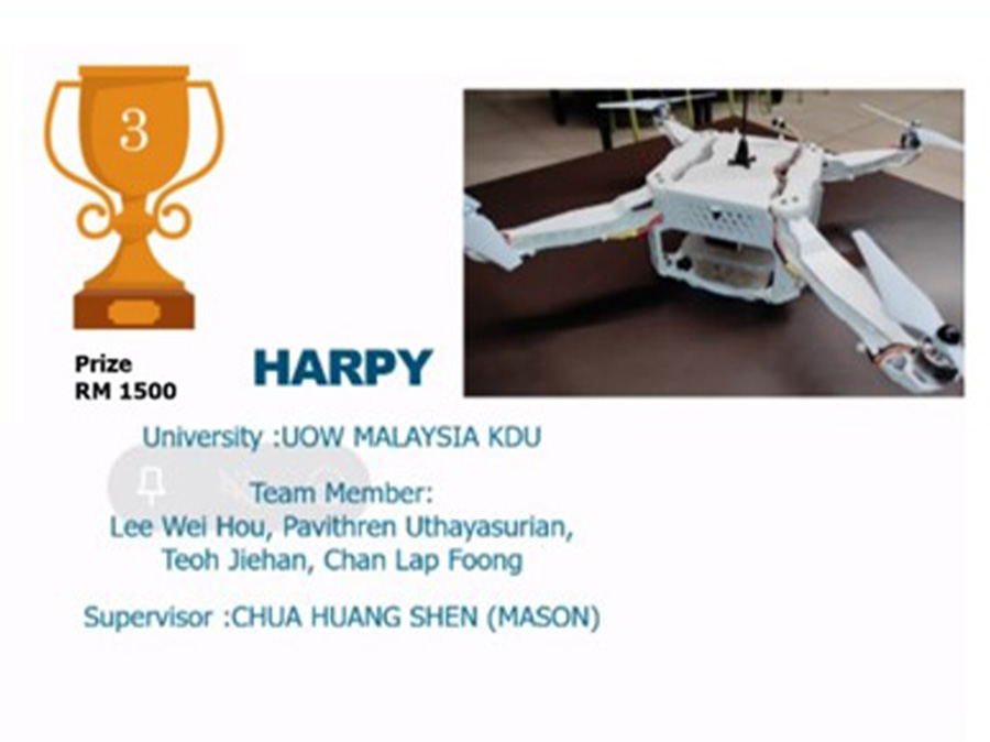 Congratulations to Lee Wei Hou, Pavithren Uthayasurian, Teoh Jiehan and Chan Lap Foong for designing and building the “Harpy Delivery Drone” and for securing 3rd place in this intense national-level competition.
