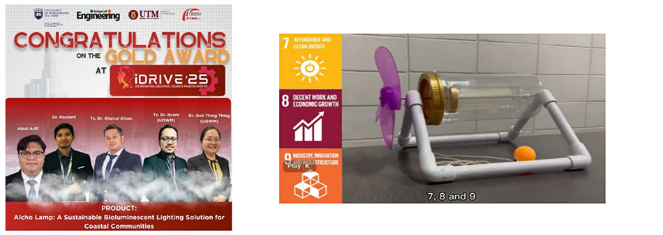 UOWM continued its winning streak at the iDrive25 – 2nd International Development, Research and Innovation Exhibition, held on 8–9 October 2025 at Universiti Tun Hussein Onn Malaysia (UTHM) in Johor. At this national-level exhibition, UOWM won 3 Gold Awards for its inventive projects, all led by Dr. Ikram: