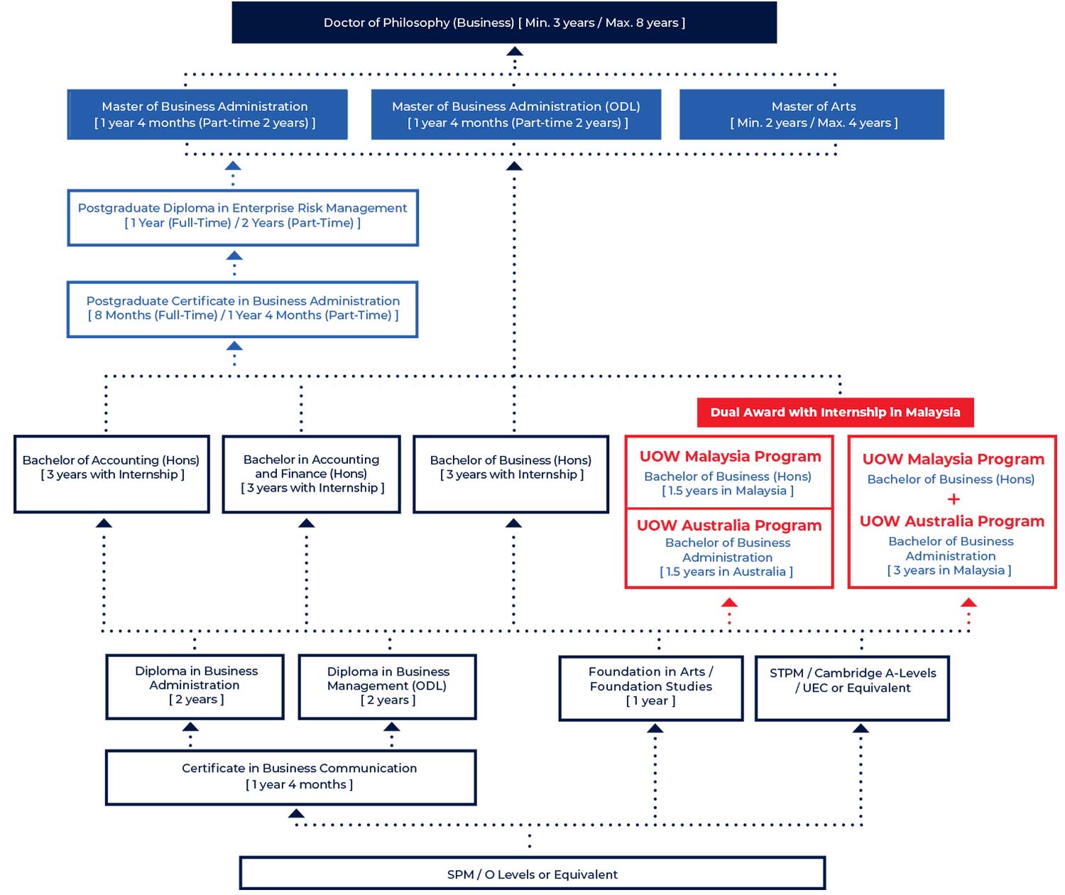 The Springboard to Success and Professionalism with Greatest Interest. The Bachelor in Accounting and Finance (Hons) provide students with a specialised education in and understanding of the legal, business and social environments in which accountancy and finance operates. It also enables students to be conversant in the technical languages and practices of the accounting and finance sector in a market economy. These include measurement and disclosure in financial statements, managerial accounting, auditing, taxation and corporate finance. Upon completion of UOW Malaysia’s Bachelor in Accounting and Finance (Hons) program at Glenmarie, Selangor campus, graduates will be granted exemptions from the following recognised professional bodies^ ACCA – Exempted from all 9 ACCA Fundamental papers CIMA – Exempted from 8 CIMA papers to complete the professional qualification ^ Subject to revision without prior notice. Validated by: University Award: Program information Highlights Program structure Study route Fee & intakes Entry requirements BUSINESS STUDIES FOR LEADERS OF THE FUTURE Grooming Business Leaders for the Future Choose UOW Malaysia to Develop Entrepreneurial Skills Students Today, Entrepreneurs Tomorrow Real World Education With Industry GROOMING BUSINESS LEADERS FOR THE FUTURE When students graduate from UOW Malaysia with a business degree, they are ready to compete and succeed anywhere in the world. At UOW Malaysia, we ensure that our students are armed with the knowledge, insights and skills, and empowered with experience, so that they stand out in our ever-evolving globalised economy and help create an economically prosperous tomorrow. The academic experience at UOW Malaysia is designed for students who not only desire to study business, but also to build the characteristics and confidence necessary for a real world experience. Our focus on communication skills, emotional intelligence, identifying strengths and pursuing passions prepare them to become driven and intuitive leaders. CHOOSE UOW MALAYSIA FOR YOUR BUSINESS STUDIES UOW Malaysia’s School of Business drive a strong focus on offering real world and experiential learning for, as well as developing entrepreneurial skills in students. Students are given opportunities to understand business organisations, systems and processes from a simulated model, learn from captains of industry, and work with industrial partners on real-world projects – giving them a head start in honing their business sense and sharpening their skills. Our focus on communication skills, emotional intelligence, identifying strengths and pursuing passion prepare them to become driven and intuitive leader. Obtained desired job, run own business, further study Over 100 companies for student internships Diverse student population from over 18 countries A purpose-built Entrepreneurialism Center Industry-Aligned Curriculum with input from Industry Advisory Panels 45% of faculty members are with industry experience Programs accredited by Professional Bodies Faculty members are active in Industry Research, Corporate Training, and Consultancy STUDENTS TODAY, ENTREPRENEURS TOMORROW At UOW Malaysia, students are encouraged to cultivate an entrepreneurial mind – to be bold, innovative and adaptable. All students that are taking business studies are required to undergo the Entrepreneurship module, anchored by the School of Business. In the pursuit of nurturing budding entrepreneurs, the School of Business set up its own Enterprise Centre and partnered with Malaysia Practice Enterprise Centre (MyPEC) for its business simulator program. Under the Entrepreneurship module, students work in teams to run a business and solve its problems and issues in a virtual environment. The simulated set-up allows students to use various web-based applications including the SKOLA trading platform, human resources, administration and marketing platforms; providing students with the opportunity to experience different scenarios that occur in a real-world business environment. This teaches students the various methods of facing different situations, taking calculated risks and learning from failures. Besides the simulated environment, students also go through the process of conceptualising, developing and fine-tuning business ideas, which will be pitched to angel investors. The module is taught by lecturers who have had vast industry experience and who are members of the Malaysian Business Angels Network (MBAN). REAL WORLD EDUCATION WITH INDUSTRY Students at UOW Malaysia’s School of Business are driven to be industry-ready. Essential to their academic learning and experience are our collaborations with industry partners, all designed to ensure our students get an edge above others even before they graduate. Duration 3 years Program Location University of Wollongong Malaysia, Glenmarie Core YEAR 1 Oral Communication Writing and Referencing Principles of Economics Financial Accounting Management Accounting 1 & 2 Principles of Marketing Principles of Management Principles of Finance Business Law Quantitative Methods YEAR 2 Accounting Information Systems Auditing Company Law Corporate Finance Financial Markets and Institution Financial Reporting 1 & 2 Financial Management Intermediate Taxation Introduction to Taxation Research Methodology YEAR 3 Advanced Audit and Assurance International Finance Investment Analysis Elective (1 subject) Final Year Project Internship Electives Organisational Behaviour Operations Management Business Digitalization Digital Strategy MPU Penghayatan Etika dan Peradaban (Malaysian Students) Bahasa Melayu Komunikasi 2 (International Students) Falsafah dan Isu Semasa Entrepreneurship Integrity and Anti-Corruption Global Social Responsibility Bahasa Kebangsaan A* Notes Bahasa Kebangsaan A is compulsory for all Malaysian students without a credit in SPM Bahasa Malaysia. without SPM Bahasa Malaysia (applicable to students from UEC, O Level, or other equivalent