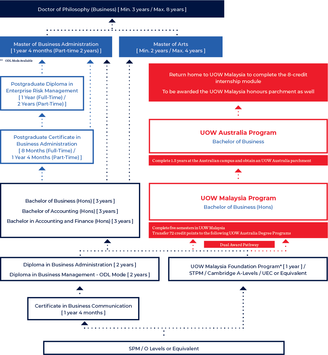 Getting down to business Business is everywhere, virtually and physically. Get ahead-start in learning how to manage a business with UOW Malaysia’s Diploma in Business Management program by Open and Distance Learning (ODL) mode. This program provides students with necessary foundation and knowledge of growing a business in today’s fast paced competitive work environment. The program in Glenmarie Campus offers flexibility for students who prefers to learn at their own pace and place, hence not restricted by the traditional time fix classes. The program is expected to produce quality graduates as well as meet the requirements set by the business industry, marketing, finance, and human resources management. This is achievable by exposing them to a well-balanced curriculum that is industry driven. A combination of understanding the concepts of business, critical thinking and ethics is constantly instilled by the respective subjects. The offered curriculum is expected to produce graduates that are well versed in the field of business and marketing apart from being sensitive to new ideas, societal issues and humankind. University Award: Program information Highlights Program structure Study route Fee & intakes Entry requirements BUSINESS STUDIES FOR LEADERS OF THE FUTURE Grooming Business Leaders for the Future Choose UOW Malaysia to Develop Entrepreneurial Skills Students Today, Entrepreneurs Tomorrow Real World Education With Industry GROOMING BUSINESS LEADERS FOR THE FUTURE When students graduate from UOW Malaysia with a business degree, they are ready to compete and succeed anywhere in the world. At UOW Malaysia, we ensure that our students are armed with the knowledge, insights and skills, and empowered with experience, so that they stand out in our ever-evolving globalised economy and help create an economically prosperous tomorrow. The academic experience at UOW Malaysia is designed for students who not only desire to study business, but also to build the characteristics and confidence necessary for a real world experience. Our focus on communication skills, emotional intelligence, identifying strengths and pursuing passions prepare them to become driven and intuitive leaders. CHOOSE UOW MALAYSIA FOR YOUR BUSINESS STUDIES UOW Malaysia’s School of Business drive a strong focus on offering real world and experiential learning for, as well as developing entrepreneurial skills in students. Students are given opportunities to understand business organisations, systems and processes from a simulated model, learn from captains of industry, and work with industrial partners on real-world projects – giving them a head start in honing their business sense and sharpening their skills. Our focus on communication skills, emotional intelligence, identifying strengths and pursuing passion prepare them to become driven and intuitive leader. Obtained desired job, run own business, further study Over 100 companies for student internships Diverse student population from over 18 countries A purpose-built Entrepreneurialism Center Industry-Aligned Curriculum with input from Industry Advisory Panels 45% of faculty members are with industry experience Programs accredited by Professional Bodies Faculty members are active in Industry Research, Corporate Training, and Consultancy STUDENTS TODAY, ENTREPRENEURS TOMORROW At UOW Malaysia, students are encouraged to cultivate an entrepreneurial mind – to be bold, innovative and adaptable. All students that are taking business studies are required to undergo the Entrepreneurship module, anchored by the School of Business. In the pursuit of nurturing budding entrepreneurs, the School of Business set up its own Enterprise Centre and partnered with Malaysia Practice Enterprise Centre (MyPEC) for its business simulator program. Under the Entrepreneurship module, students work in teams to run a business and solve its problems and issues in a virtual environment. The simulated set-up allows students to use various web-based applications including the SKOLA trading platform, human resources, administration and marketing platforms; providing students with the opportunity to experience different scenarios that occur in a real-world business environment. This teaches students the various methods of facing different situations, taking calculated risks and learning from failures. Besides the simulated environment, students also go through the process of conceptualising, developing and fine-tuning business ideas, which will be pitched to angel investors. The module is taught by lecturers who have had vast industry experience and who are members of the Malaysian Business Angels Network (MBAN). REAL WORLD EDUCATION WITH INDUSTRY Students at UOW Malaysia’s School of Business are driven to be industry-ready. Essential to their academic learning and experience are our collaborations with industry partners, all designed to ensure our students get an edge above others even before they graduate. Industry Cooperative Education Program Industry partnership through adoption of specific module at UOW Malaysia provides our students an opportunity to network with their potentially future employers and apply classroom learning in real-world situations. In most cases, students will go through a series of training modules – from sessions on financial literacy to retail and customer service insights, people management, and other relevant operational areas. The holistic learning eco-system enables students to create and execute their own business plan, which forms part of the practical student assessment throughout their education journey. Revolutionary Business Simulation As the world of business transforms rapidly with the adoption of digital economy, the paradigm shift has resulted in greater demand for organisation with soft skills and entrepreneurial mindset. Students’ adaptability of this new era would enhance their innovativeness and productivity, hence contributing in the soc