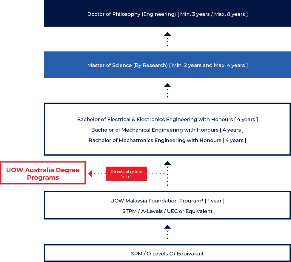 Engineering Plays a Pivotal Role in Our Lives, and It Is No Surprise Engineers are in Great Demand Globally Are you interested in pursuing a career in engineering, but not too sure of which area to specialise in? A Foundation in Engineering might just be the program for you. You will be able to develop core competencies in the field of engineering, which will give you a head start among your peers. The program will challenge you to develop skills and techniques, as well as ensure you know the basic engineering principles. Why Pursue a Foundation in Engineering at UOW Malaysia? As a pre-university program, the Foundation in Engineering is designed to introduce students to the core principles of engineering. It is most suitable for those with a keen interest in the field who want to explore engineering foundation courses in Malaysia and prepare for a future career as an engineer. If you’re considering a Foundation in Engineering, here is why UOW Malaysia should be your first choice: Gain a strong foundation in physical sciences, engineering and language skills to prepare for engineering degree programs Take courses in mechanics, electronics, robotic and technical drafting to help you choose a specialised field of engineering Enjoy a seamless transition into engineering degree programs offered at UOW Malaysia upon completion University Award: Program information Highlights Program structure Study route Fee & intakes Entry requirements CHOOSE UOW MALAYSIA FOR PROBLEM-BASED LEARNING FOR OUR ENGINEERING COURSES BRIDGING THE GAP BETWEEN ACADEMIA AND INDUSTRY DESIGN-CENTRIC CURRICULUM Hands-on learning and real-world experience ensure our future engineers remain current and relevant. Through direct engagement with industry experts, development of real-world projects and exposure to current challenges, our students are grounded in actual practice and are ready for a career in the field of engineering. Engineering courses at UOW Malaysia emphasise a Design-Centric Curriculum (DCC), with Design Thinking as the grounding principle of teaching and learning. Students are required to engage in design assignments, Capstone projects and Problem-Based Learning (PBL) to develop their skills in design, complex problem-solving, project management, teamwork, lifelong learning and complex communication. COMPETITIVE SYLLABUS TO ENHANCE ENGINEERING KNOWLEDGE AND SKILLS Industry Advisory Panel: Our Industry Advisory Panel features industry professionals and engineers from ABB Malaysia, ProvenPac, YTL Construction and more, offering direct insight into industry trends to enhance our curriculum and students’ learning. Industrial Project: Students undertake final-year engineering projects in collaboration with industry partners. These are based on real-world problems, sharpening skills needed for success in competitive sectors offering strong outcomes. Industrial Visits: Visits to key sites such as MRT construction, Energy Commission, MEASAT Satellite Systems, Fraser & Neave and more, provide exposure to actual operations across sectors relevant to electrical and electronics engineering and mechanical systems. Young Professional Experience: Students engage with early-career engineers like Mr Loo Ping Yew (R. Stahl Engineering & Manufacturing) and Chin Ze Wei (Schneider Electric), gaining insight into the realities of careers in both mechatronics engineering and related disciplines. Industrial Training Partners: Our industrial training enhances not only engineering knowledge and technical skills but also soft skills crucial for long-term professional success. Industrial Certification Partners: Our partners consist of experienced industry professionals and engineers who bring real-world insights to our curriculum, helping students build essential skills and industry readiness before graduation. Industrial Project and Consultancy Partners: Collaborative initiatives allow students to participate in research-driven technical projects designed to address real-world industrial challenges. Duration 1 year Program Location University of Wollongong Malaysia, Glenmarie Core Chemistry Engineering Mathematics 1, 2 & 3 Fundamentals of Mechanics Fundamentals of Physics Fundamentals of Information Technology Fundamentals of Electrical and Electronics Introduction to Communication Critical Writing and Research Skills Introduction to Robotics Technical Drafting & CAD Cultural Studies Study Skills Bahasa Kebangsaan A* Notes Bahasa Kebangsaan A is compulsory for all Malaysian students without a credit in SPM Bahasa Malaysia. without SPM Bahasa Malaysia (applicable to students from UEC, O Level, or other equivalent programs) Intake dates 2025 3 February 14 April 9 June 15 September 27 October Estimated fees Local students RM23,660 International students RM32,910 Notes: International students’ fees are not inclusive of EMGS and Performance Assurance Fee Terms and Conditions Apply Academic Qualification SPM / GCE O Levels : Min. 5 Credits (5Cs) inclusive of a Credit in Mathematics and Physics and a Pass in English UEC : Min. 3 Credits (3Bs) inclusive of a Credit in English, Mathematics and Physics Home Schooling with SAT : Pass Year 11 and SAT score of 1050 over 1600 with minimum score of 550 for Mathematics and Physics* English Requirement Local Student : Pass (SPM / 1119 / UEC / O Levels English) International Student : Band 4.0 in IELTS; or a min score of 30 (IBT) or 5 (Essentials-Online) in TOEFL; or Cambridge English (140); or PTE Academic (36); or UOW Malaysia English Entrance Test (60) Notes If English language requirements are not fulfilled, additional English module(s) may be taken at UOW Malaysia. APPLY NOW