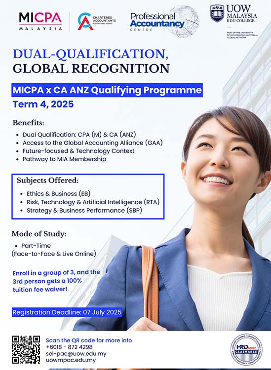 The MICPA x CA ANZ Qualifying Program – Advanced Stage Examination (ASE) MICPA is the oldest professional accountancy body in Malaysia, established in 1958 that has developed many reputable luminaries in industry over the decades. The ASE jointly offered with CA ANZ is known to be a holistic one that doesn’t just focus on technical knowledge, but also in developing well-rounded professionals with strong analytical, critical thinking & problem-solving skills, as well as heightened soft skills brought out through group work & team presentations. This makes our Program truly unique by incorporating all these elements, & developing professionals who are highly sought-after by employers & well-received in industry. In keeping up with the times, we were pleased to launch the MICPA x CA ANZ Qualifying Program (ASE) in 2022 which includes the addition of technology-based subjects into the Program, & showcases a revolutionary method of delivering content through fully coursework-based modules & minimal invigilated examinations – aimed to ensure a deeper understanding of key concepts & theories underpinning an accountant’s work. The MICPA x CA ANZ Qualifying Program provides: Greater learning flexibility allowing candidates to balance work & study efficiently. More impactful learning through a blend of digital & face-to-face options. Rigorous & authentic assessments based on real-world scenarios that integrate technical & professional capabilities. Computational thinking helps candidates understand the relevance of technologies & making use of digital platforms & tools used to analyse complex financial models. For employers, the revised Program is designed to provide: Learning flexibility & a staggered exam timetable that reduces resourcing strains on firms during peak periods. Targeted content that creates better trained graduates & reduced training costs. Learner support that improves the employee experience & boosts retention. Program information Highlights Program structure Study route Fee & intakes Entry requirements MICPA x CA ANZ Qualifying Program – Virtual Outreach for Term 1, 2025 Established as the only Malaysian professional accountancy body since 1958, The Malaysian Institute of Certified Public Accountants (MICPA) has been developing professional accountants in Malaysia through its professional examinations since 1963, & has been a founding member of the International Federation of Accountants (IFAC) since 1977. Since its inception, MICPA has played a key role in the setting of accounting standards & technical advisory for the Malaysian regulatory bodies responsible for carving out the business and financial landscape of this nation. In 2009, MICPA entered into an agreement with Chartered Accountants Australia & New Zealand (CA ANZ), then known as the Institute of Chartered Accountants Australia, to offer a joint Program which leads to 2 professional qualifications awarded by both bodies, & access to the Global Accounting Alliance (GAA). Graduates of the MICPA x CA ANZ Qualifying Program will be entitled to apply for memberships with MICPA & CA ANZ upon fulfilling all requirements & can subsequently carry the titles – Certified Public Accountant (Malaysia) & Chartered Accountant (ANZ). As a MICPA member, you will be kept up-to-date on the standards, statutes, laws & other regulatory requirements, as well as any international implications that matter to businesses & your clients operating in Malaysia. Outside of Malaysia, you would require the same level of local technical support in the country you are in, & that’s where CA ANZ comes in for Australia & New Zealand, & the GAA for 10 other countries across the globe. Dual qualification – CPA(M) & CA(ANZ) Global recognition Access to the Global Accounting Alliance (GAA) Strong technical support & representation locally & globally Access to MIA membership Duration 1 year (Full-Time) / 2 years (Part-Time) Program Location UOW Malaysia KDU College, Utropolis Glenmarie Core Notes 4 terms offered per year with full and part-time study mode. All subjects can be completed within 1 year through full-time study, and within 2 years or more through part-time study. Students may complete up to 2 subjects per term in addition to Ethics & Business (EB). They may also commence the program in the final year of an accredited Degree (T&C applies). For each subject, students will receive a digital Study Guide and there will be Subject Discussion Forums, where they may ask questions + contribute to discussions in the learning portal. There will be workshops & group work to encourage development of social skills, teamwork & self-confidence. Moreover, there will be open book assessments to train candidates‘ critical thinking skills. Subjects with an invigilated exam component will have the exams conducted online & invigilated remotely. Students are given a time limit of 8 years to complete the program. Intake Dates 2025 Term 2, 2025* 28 Jan 25 – 5 Feb 25 Term 3, 2025* 6 May 25 – 13 May 25 Term 4, 2025* 29 Jul 25 – 6 Aug 25 *New candidates should allow a minimum of four weeks for their registration to be processed before enrolling for the first MICPA module Estimated Fees Estimated Tuition Fee: RM11,800 Estimated Fees payable to MICPA: RM18,470* *Please refer to the latest MICPA Scale of Fee via https://www.micpa.com.my/scale-of-fees/ Tuition Fee Waivers Triple Success Waiver Enroll in a group of three, and the third person will receive a 100% tuition fee waiver! HRD Corp Fund Claimable Invest in your future without breaking the bank! Yayasan Peneraju Financing Scheme Exclusive for Bumiputera students LEARN MORE Requirement Candidates must have taken ONE of these routes: Possess a Degree in Accounting or other disciplines accredited by MICPA or CA ANZ Completed the Professional Stage Examination (PSE) – (Accredited Diploma in Accounting holders) Completed the MICPA Conversion Program (MCP) – (Non-accounting degree holders) Practica