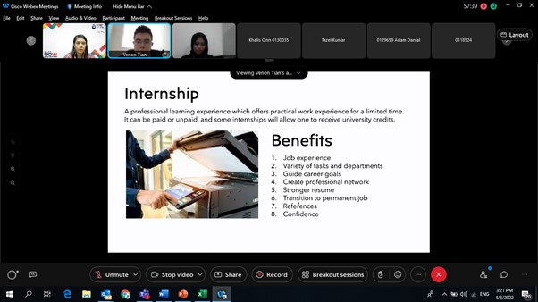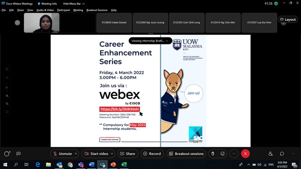3月4日,马来西亚伍伦贡伯乐组织了由学生与校友中心举办的职业提升系列活动,约2小时的活动有三个不同的环节。讲座会是为5月实习的学生而设计,以传授学生关于 “为什么实习很重要?提高能量始于实习 “的知识,随后由学生与校友中心的Azura女士进行实习简报。