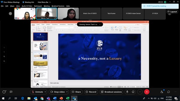 Venon是名法律专业毕业生,目前是ZUS咖啡的总经理。ZUS咖啡是一家专业的咖啡零售连锁店,目标是持续为客户制作最好的饮料并承诺提供合理价格。Venon还曾在不同的行业中担任管理职务,如零售、电信和投资。Venon也是位连续创业者,他创立了eziPOD,这是个24小时的洗衣柜服务。在座谈会中,Venon更多的是谈到了实习的重要性,以及实习如何为学生带来一个美好的未来。