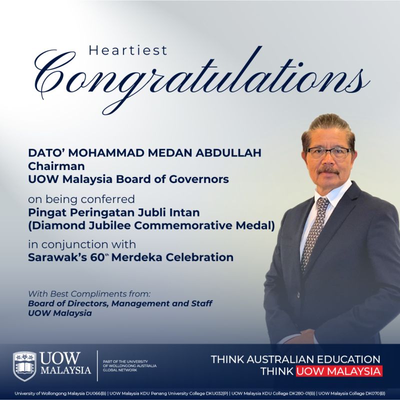 We are delighted to extend our congratulations to Dato’ Mohammad Medan Abdullah, Chairman of the UOW Malaysia Board of Governors, for being awarded the Diamond Jubilee Commemorative Medal (Gold) during Sarawak’s 60th Merdeka Celebration.