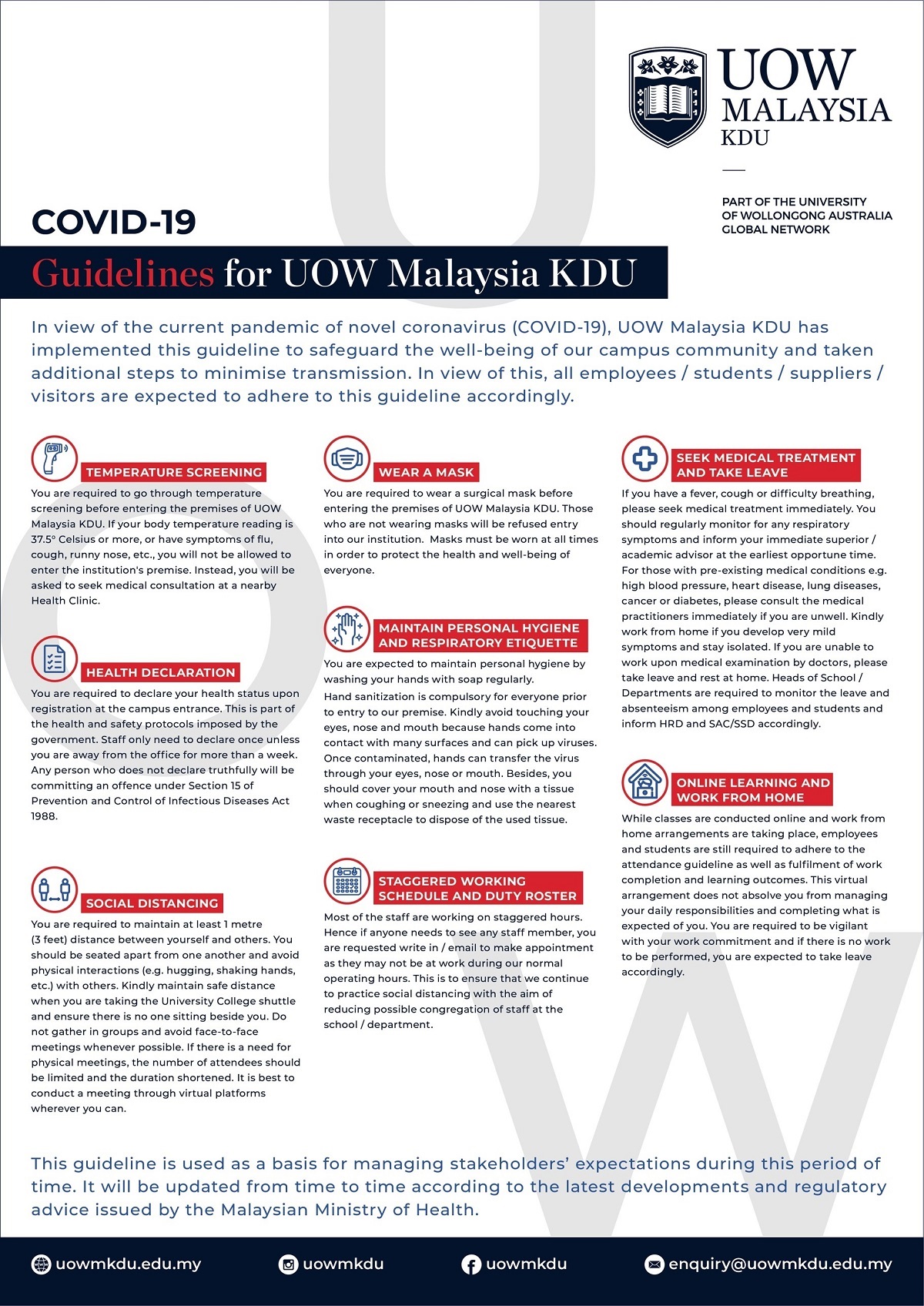 We are pleased to advise that, in accordance with Ministry of Higher Education guidelines, UOW Malaysia KDU is now working towards a staged re-opening of campuses from July 2020. While the safety of the campus community remains our priority, we are aware that students have been eagerly awaiting the re-opening of campus facilities and have responded accordingly.