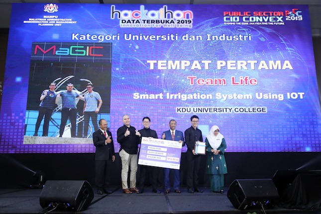 Compelled to offer a progressive solution for excessive irrigation for plants, three final year students from School of Computing and Creative Media have paved their way to excellence by emerging as champions at Open Data Hackathon Competition 2019 by inventing LIFE – Smart Irrigation System, a comprehensive, versatile cost-saving monitoring and controlling device that helps transform and digitalise farming techniques.