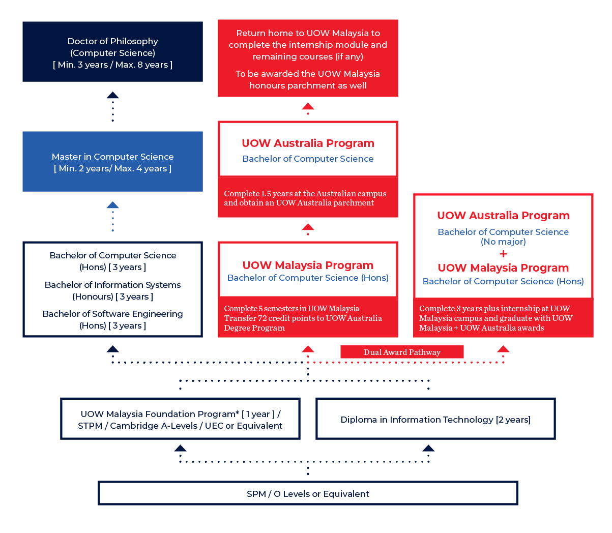 伍伦贡大学双学位 马来西亚的电脑科学学位 自从信息技术问世以来,马来西亚的电脑科学学位一直是本科课程中的热门选择。电脑科学是一个多样化和复杂的领域,它涉及到电脑的各个方面。 电脑科学学士(荣誉)学位课程的设计,旨在培养掌握电脑科学广泛方面的良好技术知识的高质量毕业生。此课程还提供了电脑科学作为一个学术学科的理解。 课程提供了一个全面的学习计划,涵盖了广泛的主题,包括面向对象的编程、人工智能、移动计算和计算数学,使用Java,C++,Android,SQL和Phyton。 为何要学习电脑科学? 在修念期间,您将学习支撑复杂计算系统、电脑图形学、电脑安全、网络技术、移动计算和人工智能等领域的技术。如果您想在马来西亚获得一个电脑科学学位,马来西亚伍伦贡伯乐槟城大学学院绝对是最佳的选择。 您本身也将开展您在编程、软件设计、电脑系统和操作方面的技术技能。此外,您也将获得广泛可转移的技能,这是许多雇主所追寻的人才。在马来西亚伍伦贡伯乐槟城大学学院,我们强调为学生提供必要的技能和知识,使他们在现今世界职场中脱颖而出。作为我们课程的证明,我们的毕业生享有很高就业率。 此学位提供了以下途径: 研究生学习 本课程培养学生在电脑科学基础上有更深的知识,以研究模式攻读智能系统、图像处理和电脑视觉领域的硕士学位。 就业机会 : 作为电脑专业的毕业生,您可以从事以下工作 系统开发/网络程序员/研发软件工程师/系统分析员/数据库程序员/移动开发/技术支持 课程资料 重点 课程结构 升学路线图 学费与入学 入学要求 就业率 大多数毕业的学生跟随电脑科学学位课程进入软件行业工作,从中小型公司延伸到跨国公司。我们的许多毕业生继续在大学、政府机构和教学行业继续深造。毕业后6个月内就业率超过95%,学校定期为毕业生进行职业讲座和面试。 尖端课程,多元专业 我们的电脑课程涵盖广泛的专业领域的理论和实践知识,以应用不同的编程语言解决问题的技术。除此之外,它还包括软技能,加上程序结构,让学生在不同的文化背景下训练他们的沟通技巧。 学生在学习过程中,需要进行工业培训和电脑项目,以熟悉未来的工业相关问题。学位课程基于三个结合的结构,即学术意识,产生专业的电脑相关性和坚固的承诺就业能力。 有经验 的合格教育者 我们的学术人员在各自的领域、行业经验和研究活动中都有专长。他们是积极的研究人员,把创新的人才带来在课堂上与学生分享。我们的客座讲师来自行业,也为学生提供最新的趋势和技术提升。我们的导师参与了 “同伴辅助学习”,其中最后一年的学生在学期期间,提供可选的支持课程。 专业证书毕业通过Oracle大学学生指南电子工具包上LVC(现场虚拟课堂),以及微软技术助理(MTA)考试,文凭课程的学生有了改善动态学习的新机会。最近,该系已为文凭级别的学生启动了欧盟委员会(EC-Council)认证的道德黑客(CEH-V9)考试。简而言之,如果一个学生加入了电脑研究文凭或游戏技术文凭课程,他们在毕业时将获得专业证书,真正从其他IT毕业生的竞争对手中脱颖而出。 工业标准技术设施 电脑系拥有广泛的软件包,以支持电脑科学、电脑游戏、动画、网络和商业智能课程,包括软件/应用程序开发、移动开发、网络模拟等工具。可以免费使用商业软件,并为员工和学生提供服务器。学生可以使用马来西亚伍伦贡伯乐学府的云端API存储来存储他们的项目部署。 强大的行业联系和伙伴关系 当今的尖端技术和竞争力在全球复杂的环境中不断提高。为此,电脑系与制造业和软件业紧密合作。这是一个重要的标准,以创建一个强大和完整的行业驱动的课程,以适应学生和适合他们毕业后立即工作,以及增加和利用研究机会。电脑系的行业委员会由行业专业人士组成,为我们的课程提供建设性的反馈。 雇主包括英特尔(Intel)、戴尔(DELL)、国家仪器(National Instruments)、摩托罗拉(Motorola)等。 行业准备 马来西亚伍伦贡伯乐槟城大学学院的毕业生,无论是实习还是即时招聘,都是业界的最需要。马来西亚伍伦贡伯乐槟城大学学院的95%毕业生,在完成学业前后的3个月内受到软件行业的观察。 课程期限 3年 课程地点 马来西亚沃隆港伯乐槟城大学学院,及峇都卡湾(Batu Kawan) 核心学科 第1年 口头交流 离散数学 编程原则 Database Management & Security 面向对象编程 系统分析与设计 数据结构与算法 电脑结构 电脑网络 人机交互基础 写作与参考 第2年 操作系统与并发症 管理原则 系统基础知识 电脑图形学 智能系统 计算领域的社会和当前问题 系统安全 知识与信息工程 数据库系统 软件开发方法论 高级编程 信息技术项目管理 第3年 个人项目 1 & 2 网络安全 软件设计 现代人工智能 大数据管理 并行计算 选修课(1个科目) 工业培训 选修课 机器学习 移动应用开发 图像处理 自主移动机器人 通修科目(MPU) 道德与文明 (马来西亚学生) 马来语交流2(国际学生) 哲学和当前问题 企业家精神 廉洁与反腐败 全球社会责任 马来西亚语 (国语)A* 注解 马来西亚语(国语)A是所有马来西亚学生的必修课。 马来西亚教育文凭(SPM)国语(Bahasa Malaysia)未考获优等学分。 没有马来西亚教育文凭(SPM)国语学科(Bahasa Malaysia)(适用于统考(UEC)、剑桥O水平(O Level)或其他同等课程的学生。) 即刻申请 入学日期 2025 2月