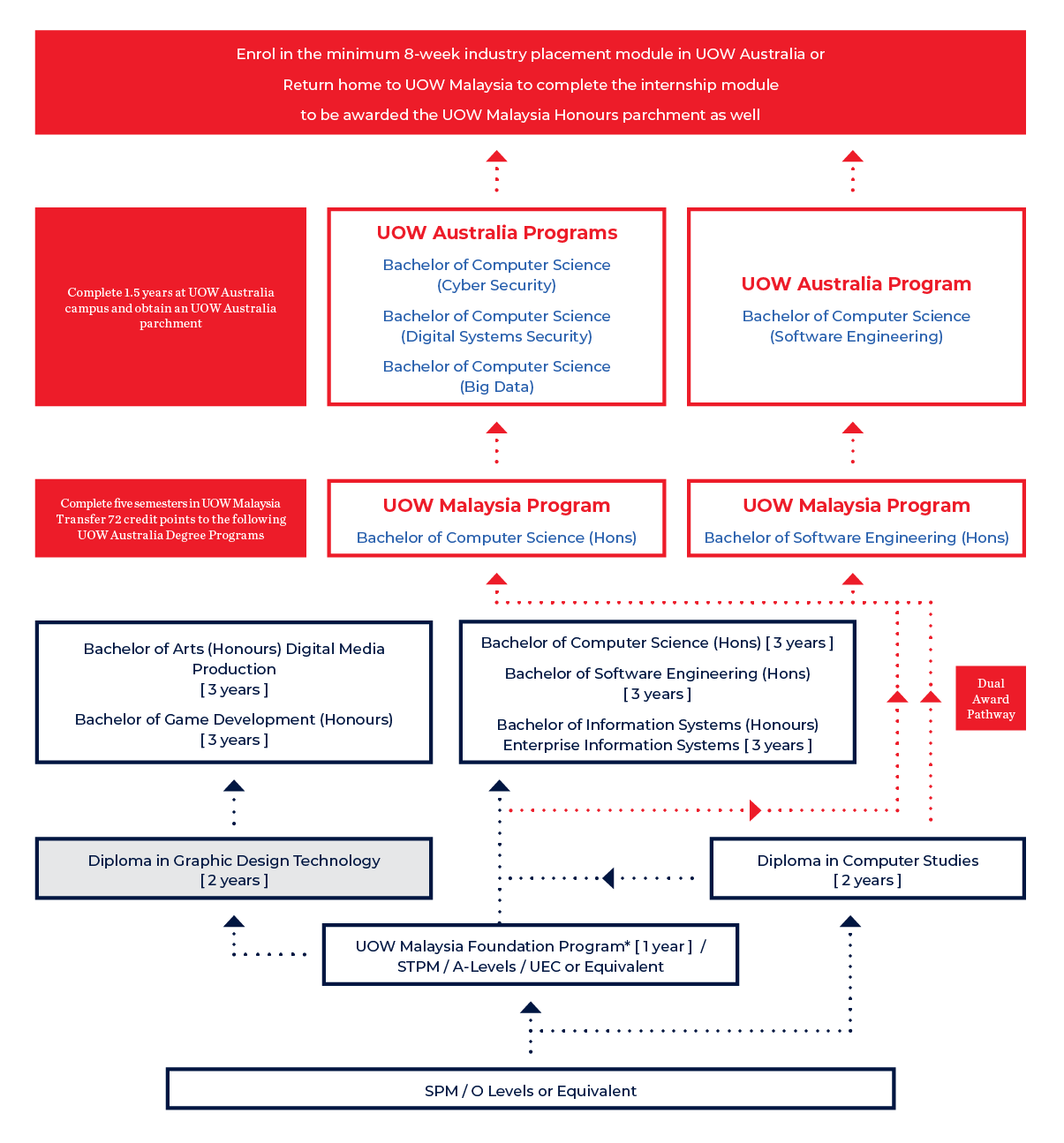 Why study Graphic Design Technology in UOW Malaysia? Diploma in Graphic Design Technology is a holistic course that merges Graphic Design and Technology, integrating up-to-date soft skills, blending academia, creativity, and professionalism to prepare graduates for a dynamic career in Graphic Design including Design Communication with Emerging Technologies. Graphic Design Technology is a good option for individuals who want to focus on application of ideas that emphasizes on practical learning with diverse assessments such as quizzes, instructional assessments, projects, and presentations. It is designed for learners who wants strong practical knowledge whilst working with technology and design solutions for communication. The program has been developed in collaboration with the industry from Advertising, User Experience and Branding experts. The syllabus will be delivered by practicing graphic design academic members who are constantly involved through real life working projects. The course is a fulltime 2-year course delivered at the Utropolis Glenmarie campus. What will I learn in Graphic Design Technology? The Diploma in Graphic Design Technology aims to nurture skilled, creative graduates for the ever-changing digital content and creative industries. It focuses on knowledge, practical skills, and soft transferable skills like adaptability and critical thinking. Graduates can expect to be multidisciplinary in various fields, such as visual communication, graphic design, digital arts, digital media, content creation, user experience (UX) production, and computer-graphics imagery (CGI), contributing to Malaysia’s status as a hub of creative talent. Careers in Graphic Design Technology The program emphasizes mainly on practical knowledge, preparing learners with practical skills for the creative industry’s future needs. Digital Graphic and Design Practitioners which includes (but not limited to) Graphic Designer, Junior Art Director, Digital Designer, Visual Designer, Technical Illustrator, Typographer, Concept Artist, Creative Technologist, Layout Artist, Multimedia Artist, UI/UX designer, Publication Designer, Packaging Designer, Advertising Designer, Entertainment Designer, Visual Communication Designer. University Award: 课程资料 重点 课程结构 升学路线图 学费与入学 入学要求 电脑课程的理想学校–伍伦贡大学马来西亚 “培养电脑奇才和游戏高手的综合教学大纲” 最好的串联式教学大纲 我们的教学大纲是与行业合作伙伴深入分析和合作的直接结果,以确保我们的毕业生不仅是就业而且还是理想的人才,可以无缝地融入行业。我们的课程不断地发展,以保持与当前行业需求和实践相关。 创意媒体 伍伦贡大学马来西亚的游戏开发学位课程,是由英国主要的游戏开发工作室和本地行业的中坚力量所认可。此课程的串联式教学大纲和行业洞察力培养出的毕业生很抢手,吸引了很多工作室,在学生毕业前就开始猎头和精挑细选人才。我们的课程有三个专业科可供选择,是最全面的游戏开发课程之一。 伍伦贡大学马来西亚还与Codemasters Studios合作,在课程设置和评估方法上采用行业基准和标准。Codemasters是英国历史最悠久的视频游戏开发公司之一,被认为是欧洲最大的独立游戏公司,仅在英国就有近700名员工。 电脑: 伍伦贡大学马来西亚了解,需要整合和缩小行业要求、实践和技术与学术传授之间的差距。无论学生选择学习电脑科,我们的教学大纲确保他们对电脑基础有很强的掌握,从编程到使用复杂算法,以及应用程序或系统的设计、构建和测试, 所有这些都是在培养一个毕业生成为分析性思维者和创造性的问题解决者的关键。 伍伦贡大学马来西亚提供电脑4个主要方面中的3个方面的课程(正如世界上最大的科学与教育电脑学会—电脑械协会所述) 电脑科学 软件工程 信息系统 “我们的强大行业合作,意味着学生积极与未来的潜在雇主合作,甚至是在毕业前!” 电脑 策略合作伙伴关系: 我们与选定的企业行业和相关组织合作,以获得实用的培训材料和知识转移的工具,以及活动和网络的机会。通过与顶级科技公司,如IEEE电脑协会,以及RapidMiner主经销商,Ouandatics(马)有限公司的咨询,学生获得真实世界的体验,并通过项目和行业参与了解最新的趋势。 认证准备: 通过我们的合作伙伴关系,学生可以接触并准备参加外部认证考试和专业认证过程。 MyGameDev人才培养计划: 2012年,高等教育部授予伍伦贡大学马来西亚,在经济转型计划和国家关键成果领域(教育)下的PEMANDU切入点项目倡议,以引领马来西亚的游戏开发行业,专注于意识和人才建设活动。这个游戏开发集群代表着教育机构和游戏开发行业之间策略合作的开始,以在游戏开发领域创造一个高收入、可持续的创意经济。 在数字游戏领域,衡量成功与否的主要标准是人才的临界质量。如果没有临界质量,就很难找到支持,留住人才,并吸引国际知名度和信誉度。为了保持人才源源不断地进入游戏开发行业,MyGameDev的作用是确保相关机构,不仅能培养出为行业做好准备的毕业生,而且还能准备好一批原始的中学后学生人才,为这一管道输送人才。 课程期限 2年 课程地点 沃隆港大学马来西亚,格林玛丽大学城(Glenmarie) 核心学科 第1年 现代艺术文化与平面设计 设计思维 绘图概论入门 平面设计入门 色彩研究 個人品牌 字体排版 计算机图形学 1 口头交流 广告原则 计算机图形学 2 包装设计 第2年 环境设计 平面设计 1 3D 建模和可视化 用户体验/用户界面设计 动态图形的平面设计 平面设计 2 活动开发 专业研究 选修