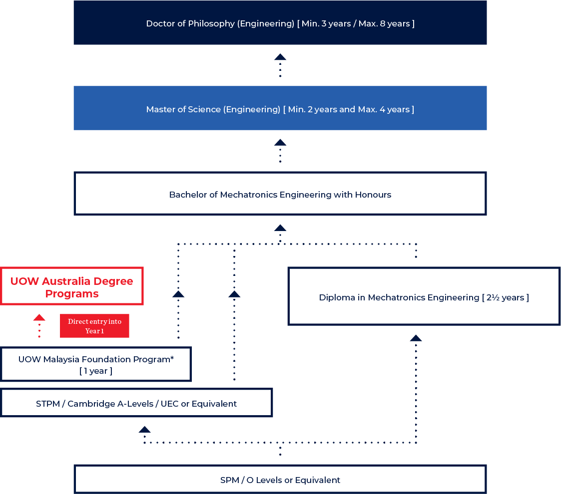 Mechatronics is a multidisciplinary field that focuses on mechanical, electronics and computing, in creating engineering solution. 此课程基础广泛,专门设计将三个主要领域–电气、电子和机械工程,整合为一个流。这些课程提供了学生有关理论和实践的介绍,让学生进入电气,电子和机械工程的职业生涯。这个全面的,有组织的和有重点的课程为学生提供了更多的灵活性,选择或定制他们的职业道路和努力。 Why Study Diploma in Mechatronics Engineering at UOW Malaysia KDU Penang University College, Batu Kawan? Mechatronics is a multidisciplinary field that focuses on mechanical, electronics and computing, in creating engineering solutions. This program is broad-based and specifically designed to integrate three major areas – electrical, electronics and mechanical engineering – into one stream. These courses give students a theoretical and practical introduction to a career in electrical, electronics & mechanical engineering. This comprehensive, organized and focused program provides the students with more flexibility in choosing or tailoring their career paths and endeavors. University Award: 课程资料 重点 课程结构 升学路线图 学费与入学 入学要求 工程学课程可能不是最容易学习的领域,但仍然是有需求的学科领域,而且毕业生也更有可能很快找到工作,并并凭借自己的工程学学位逐步升职。在马来西亚努力成为发达国家之际,工程师在通过科技进步提高生活质量方面可以发挥关键作用。由于扮演如此关键的角色,对合格和有技能的工程师的需求不断增加,而且将继续遍布世界各地。 学习工程还能带来声誉、广泛的职业发展机会、改善世界的机会、全球旅行和就业机会,以及职业满意度。更重要的是,它为职业成功奠定了基础。工程师可以成为企业家,我们称他们为“技术企业家”。 专业教育者 我们有超过30%的博士院士和来自全球领先企业的行业专家,我们提供真实世界的技术创新和行业洞察。 行业认证毕业生 马来西亚伍伦贡伯乐槟城大学学院(UOW Malaysia KDU Penang University College )提供行业认证的毕业生和专业证书(例如MyTRIZ, Labview, SolidWorks, Mentor Graphics),有处理和解决行业相关问题的经验,这确保了毕业后能顺场地到就业岗位。 世界级合作伙伴 我们与英国一流大学合作,为您提供在马来西亚接受世界一流教育的机会。诺森比亚大学(Northumbria University)的毕业生进入专业就业的人数在英国排名前十。 课程期限 2年半 课程地点 马来西亚沃隆港伯乐槟城大学学院,及峇都卡湾(Batu Kawan) 核心学科 第1年 半导体器件与应用 电路I 工程数学I 电脑系统基础 数字电子 写作与参考 工程数学II 基础编程 电气线路II 第2年 工程数学III 微控制器系统设计与应用 模拟电子学 工程中发明性问题解决法导论 电脑辅助设计/绘图 工程材料 机电一体化系统设计 仪表和控制 机器人和自动化 项目实验室1 工业培训 第3年 项目实验室2 电机 应用气动和液压 通修科目(MPU) Penghayatan Etika dan Peradaban (马来西亚学生) 马来语交流1 (国际学生) 个人发展技能 廉洁与反腐败 团队协作和社区 马来西亚语 (国语)A* 注解 马来西亚语(国语)A是所有马来西亚学生的必修课。 马来西亚教育文凭(SPM)国语(Bahasa Malaysia)未考获优等学分。 没有马来西亚教育文凭(SPM)国语学科(Bahasa Malaysia)(适用于统考(UEC)、剑桥O水平(O Level)或其他同等课程的学生。) 入学日期 2025 2月3日 4月14日 6月9日 9月15日 10月27日 估计费用 本地学生 RM38,510 国际学生 RM53,300 注解: 上述费用不包括签证和绩效保证费 不包括专业/认证费用 适用条款和条件 学术资格 马来西亚教育文凭(SPM )/ 剑桥O水平(GCE O Level): 3门学科优等,包括数学与1门相关科学科目 统考( UEC ): 3门学科优等,包括数学与1门科学科目 马来西亚技术文凭(Sijil Kemahiran Malaysia): 通过相关领域的3级文凭 英语要求 本地学生: 通过(英语达到马来西亚教育文凭水平或同等) 国际学生: 雅思(IELTS) 5.0分;或托福网考(IBT)最低42分或托福笔试(PBT)410分;或剑桥高级英语证书考试(CAE) 和熟练英语证书考试(CPE)(从2015年) 评分154;或PTE学术英语47分 注解 如果未达到英语要求,可在伍伦贡大学马来西亚府选修额外单元的英语课程。 即刻申请
